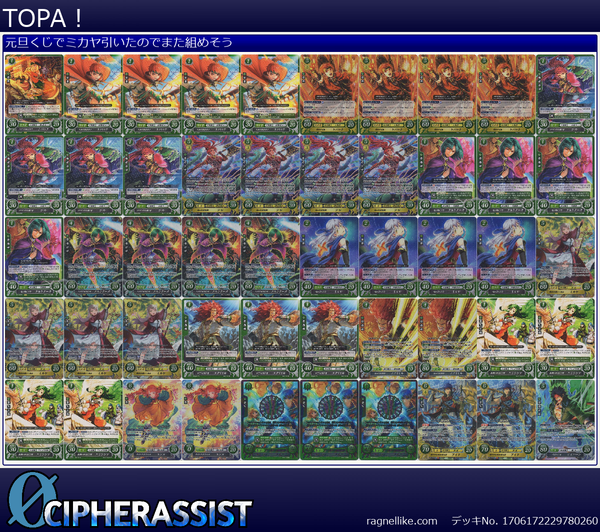 | P05-015PR 暁の団の少女 ミカヤ | 4枚 | メダリオン | 2 | なし | 40 | 20 | 1-2 | 女 | 魔法 |