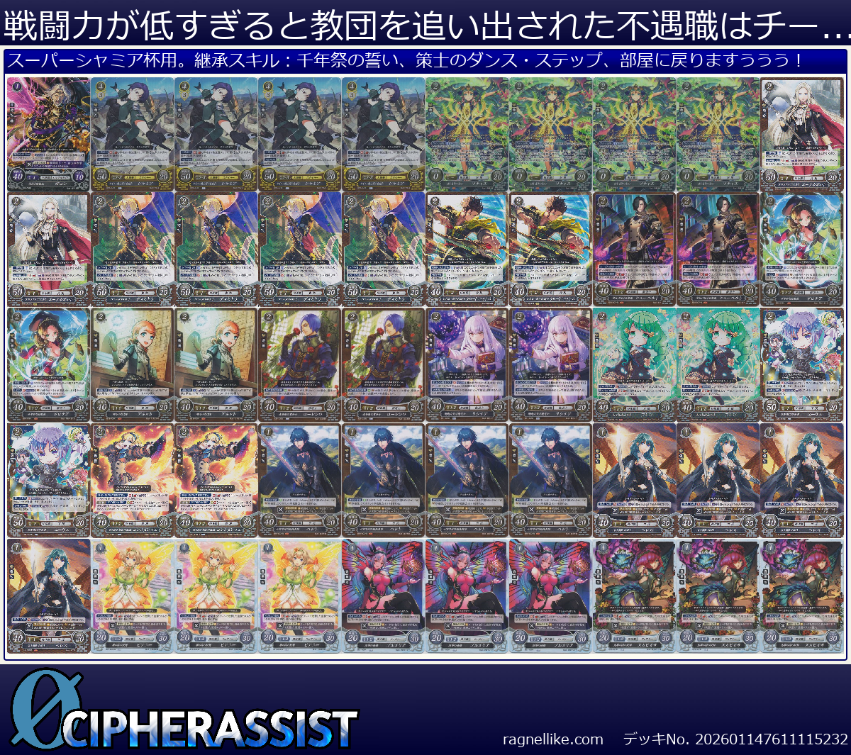 | B21-043R セイロス騎士団の名射手 シャミア | 4枚 | 女神紋 | 4 | 3 | 50 | 20 | 2-3 | 女 | 弓 |