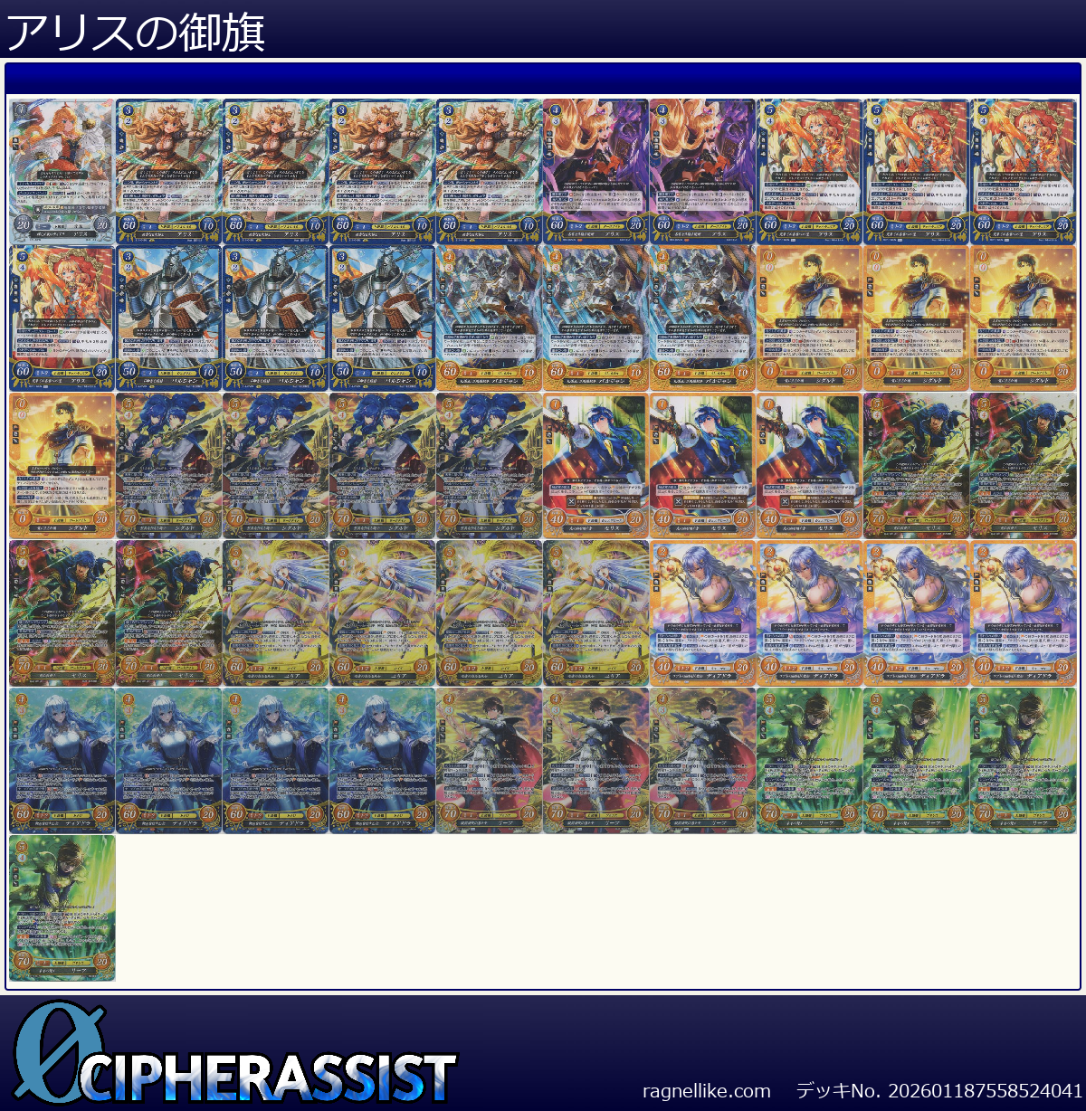 | B17-097SR 神血を宿す乙女 ディアドラ | 4枚 | 聖戦旗 | 4 | 3 | 60 | 20 | 1-2 | 女 | 魔法 |